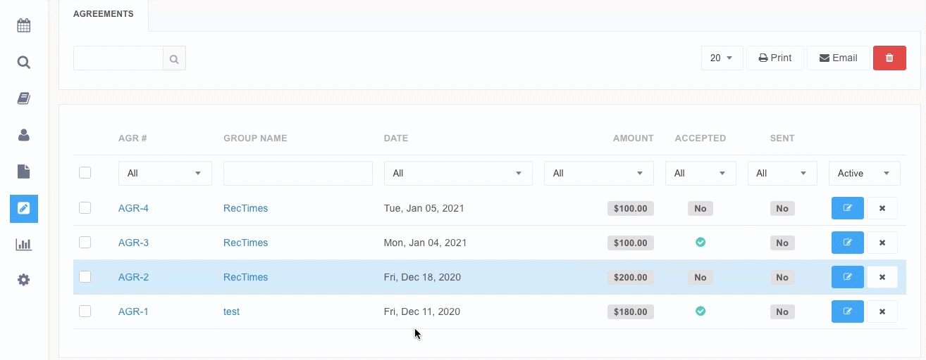 From the Agreements tab in the left-hand menu, select one or more agreements you want to cancel, then click the red trash bin icon in the top-right corner.