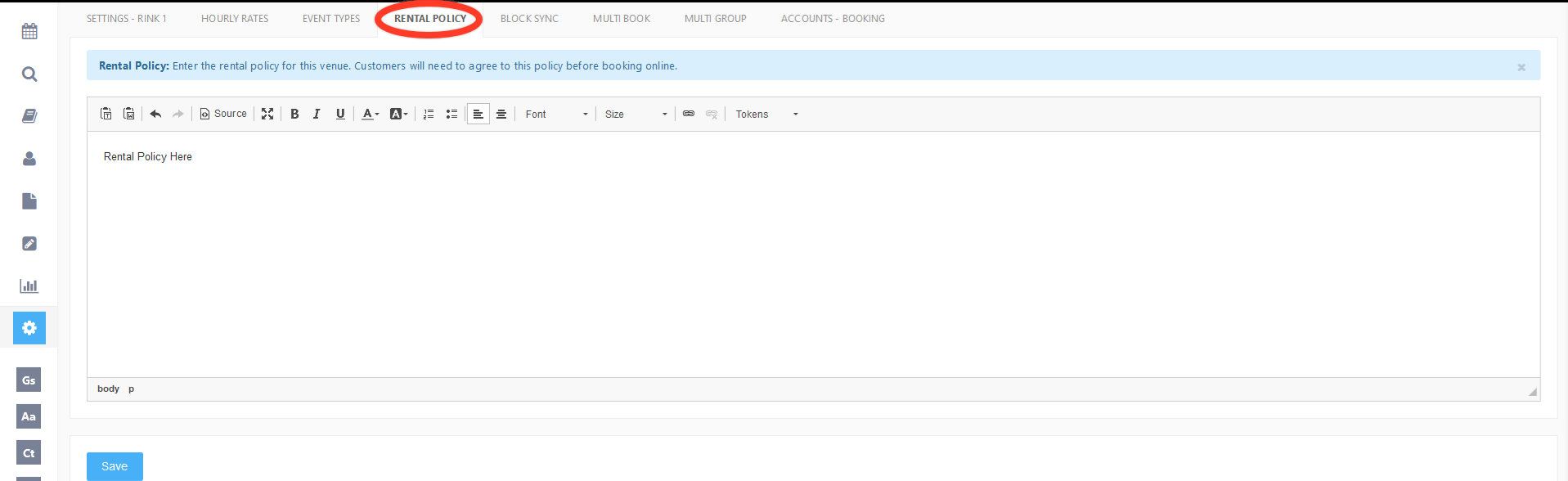 Every time a customer booking is made online they will need to agree to your rental policy. This policy can be different for each venue. To add or edit your rental policy go to Settings - {Venue Name} select the tab Rental Policy.