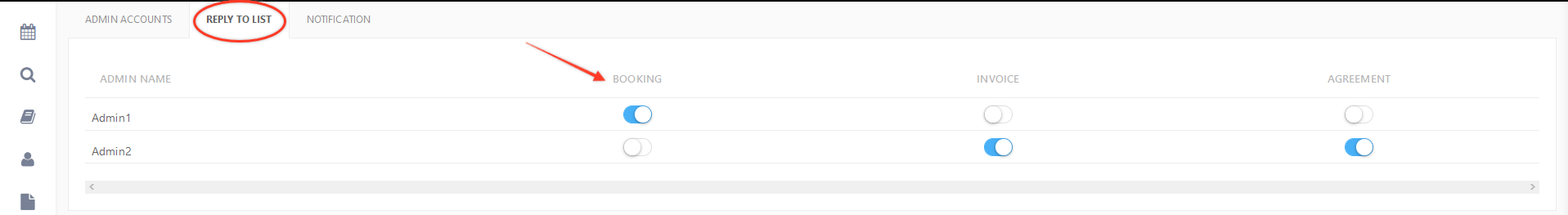 If you have a different admin working with bookings and another admin working with invoices, you can select who is the reply address for each section. One admin can also be the choice for every section.