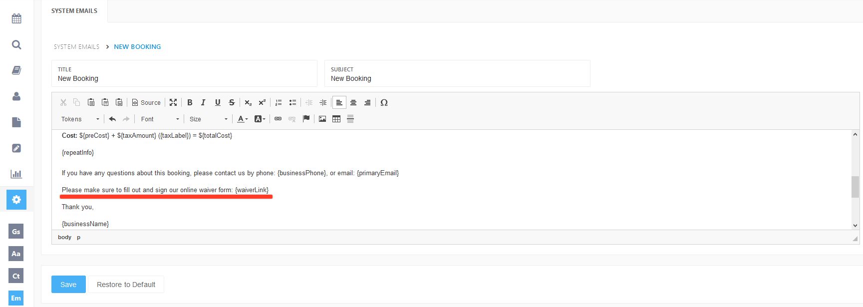 - Waiver tags allow you to easily add your waiver to your selected email template so whenever that email is sent, the waiver link will be in the email to your customers without having to adjust and add the waiver each time.