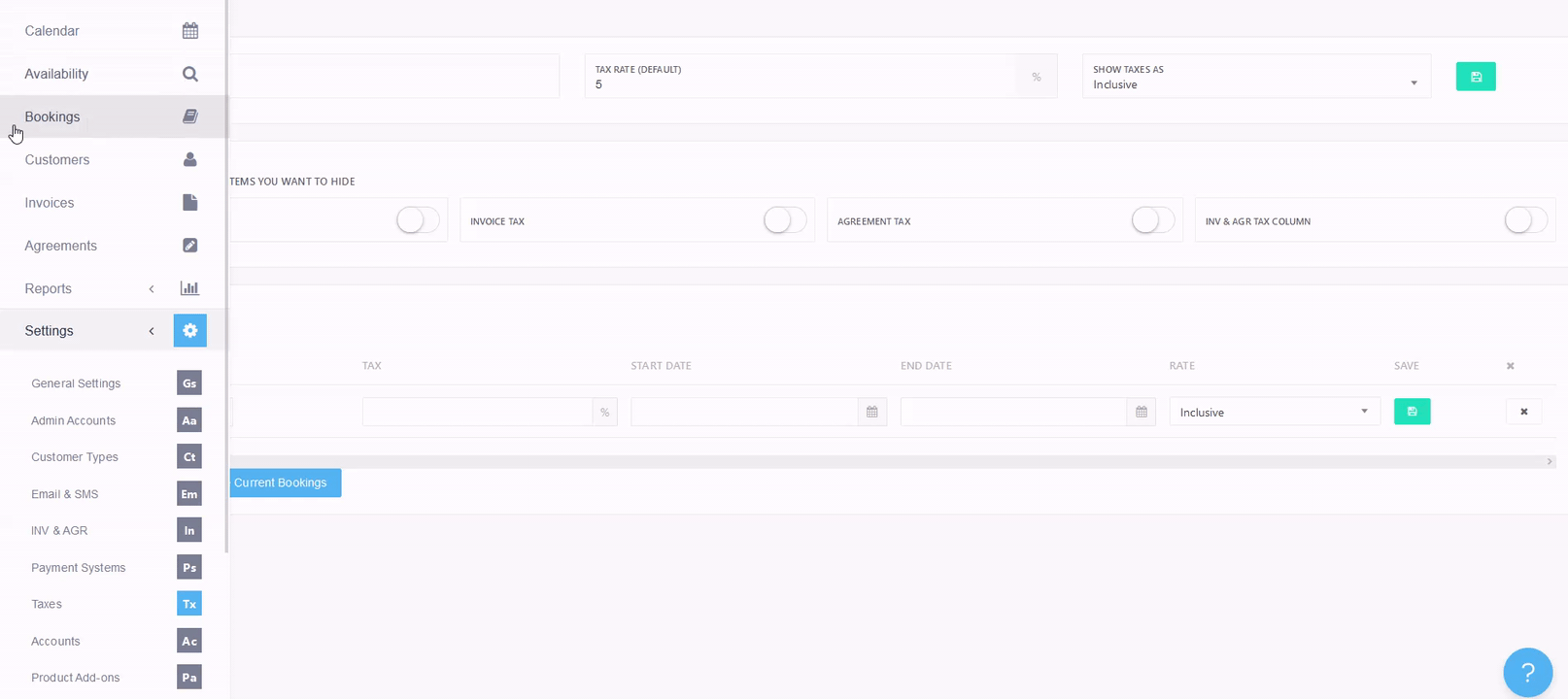 If taxes apply to your facility, you can edit your default tax label and rate in your left hand slide-out menu under Settings > Taxes. Here you can also choose whether taxes are inclusive or exclusive.