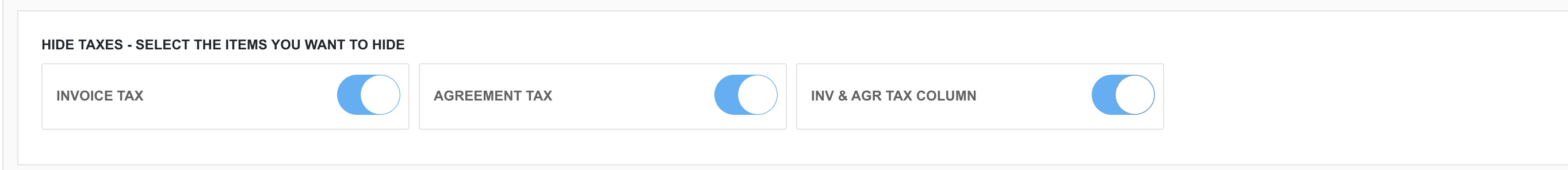 If you choose to hide the tax column/information on Invoices and Agreements, toggle these settings on when you're on the Taxes page to hide them: