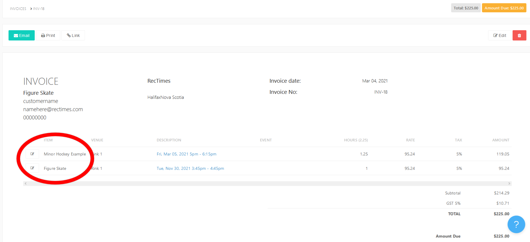 Once the Invoice is created, it will list the group or team names next to each booking.