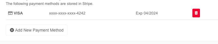 Once saved, you can view your stored payment methods. If you need to edit or update any details, simply add a new payment method with the changes, save and then delete the old payment method using the red trash bin.
